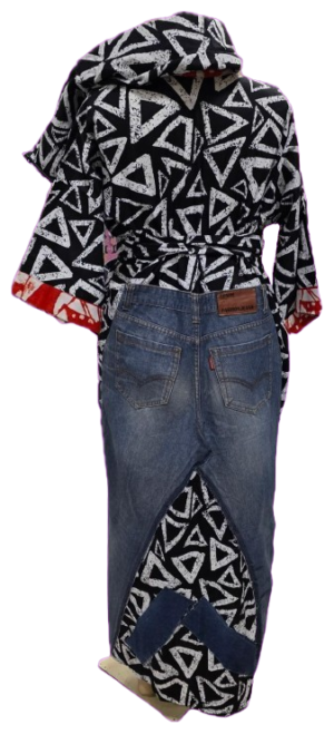 A unique fusion kimono combining upcycled denim with vibrant Ankara fabric. This one-of-a-kind, handcrafted piece celebrates sustainable fashion through bold cross-cultural design and expert craftsmanship.
