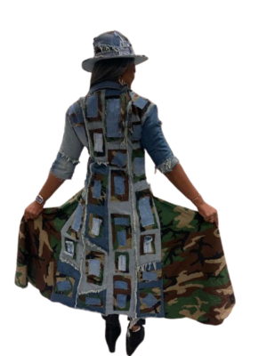 A custom handmade patchwork camouflage coat available in sizes S to 3X. Each piece is crafted to order, offering a unique and stylish design made with care.