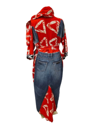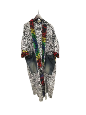 This one-of-a-kind kimono blends upcycled denim with vibrant African prints for a bold, eco-friendly statement. Featuring a relaxed, versatile fit, it offers a stylish and sustainable way to embrace cultural flair while giving new life to recycled materials.